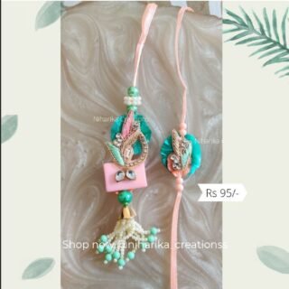 A perfect combo of exquisite pearl Niharika Creations designed bhaiya bhabhi rakhi for Rakshabandhan 2022. The rakhis have been adorned with pearl designed imitation of birds feathers and diamonds.