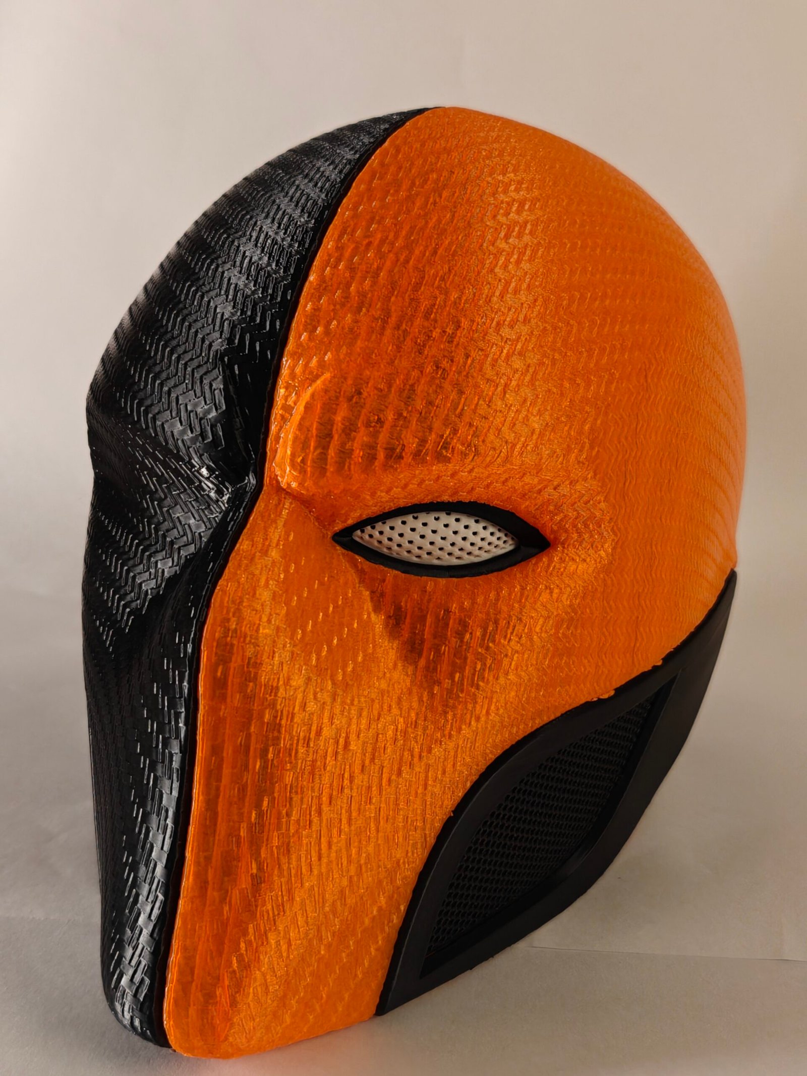 A 3D printed mask of slade wilson or Deathstroke that’s made and ships locally in India! Should fit most heads upto a hat size of 22-23 inches (circumference measured at your forehead). Halves snap on magnetically for easy assembly.