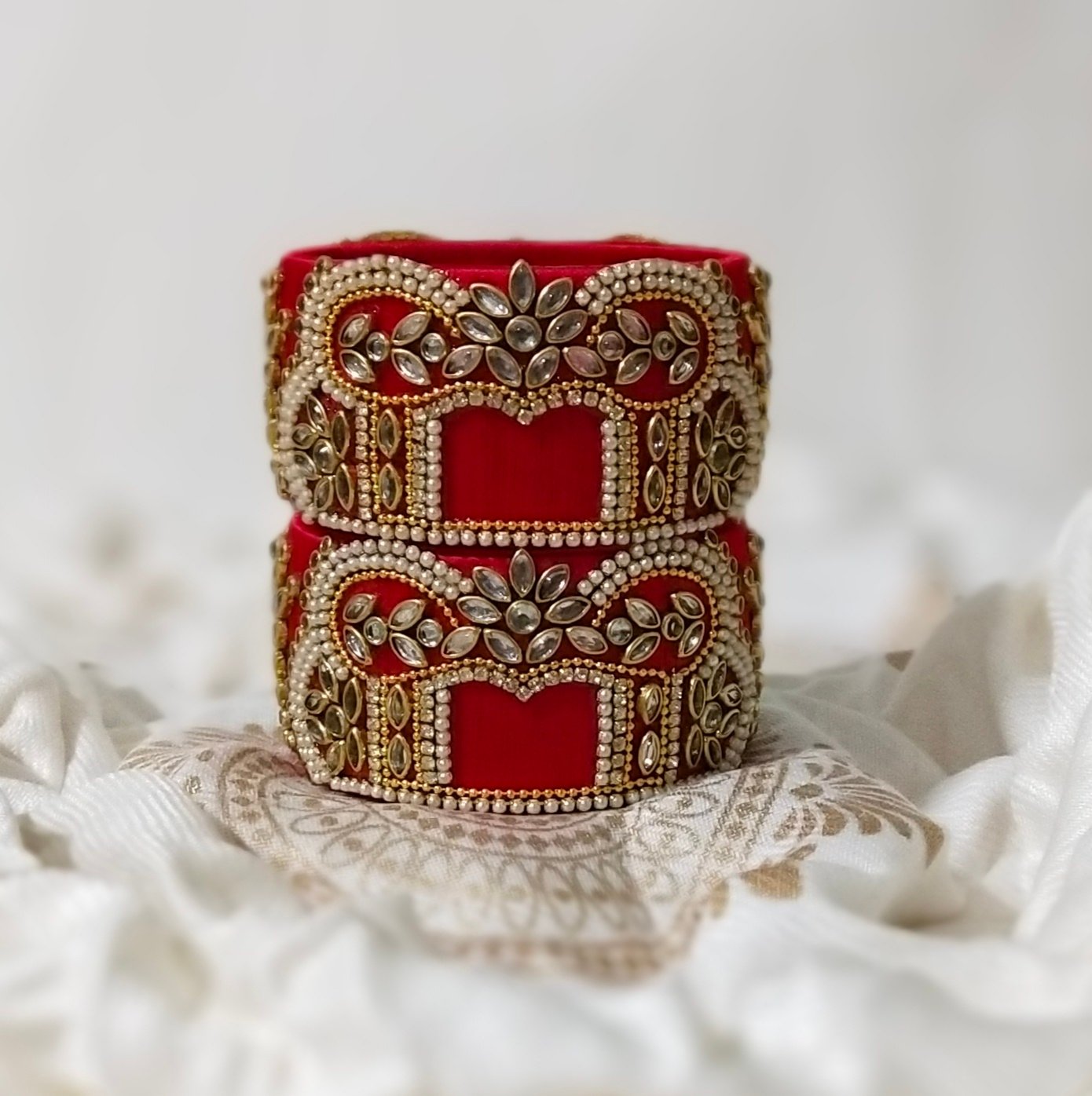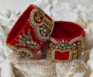 Add a touch of traditional elegance to your outfit with this stunning handcrafted Silk Thread Bangle Set. Wrapped in high-quality red silk thread and heavily embellished with sparkling Kundan stones and pearls, this set is perfect for brides, weddings, festivals, and special occasions. The intricate design gives it a royal look that complements sarees, lehengas, and ethnic suits perfectly.