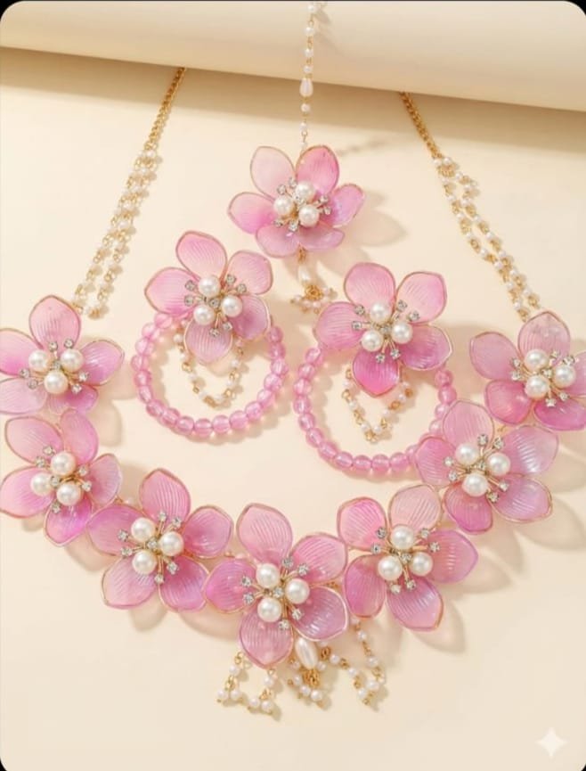 Add a touch of royal elegance to your look with this beautiful Pink Floral Pearl Necklace Set. Designed with delicate flower motifs, soft pink enamel finish and lustrous pearls, this necklace set brings a feminine and luxurious charm to any outfit.