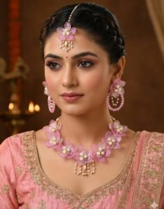 This set includes a stunning necklace, matching earrings and maang tikka, making it a perfect choice for weddings, festive occasions, parties, bridal functions and traditional wear. The lightweight design ensures comfort while giving a rich and classy appearance.