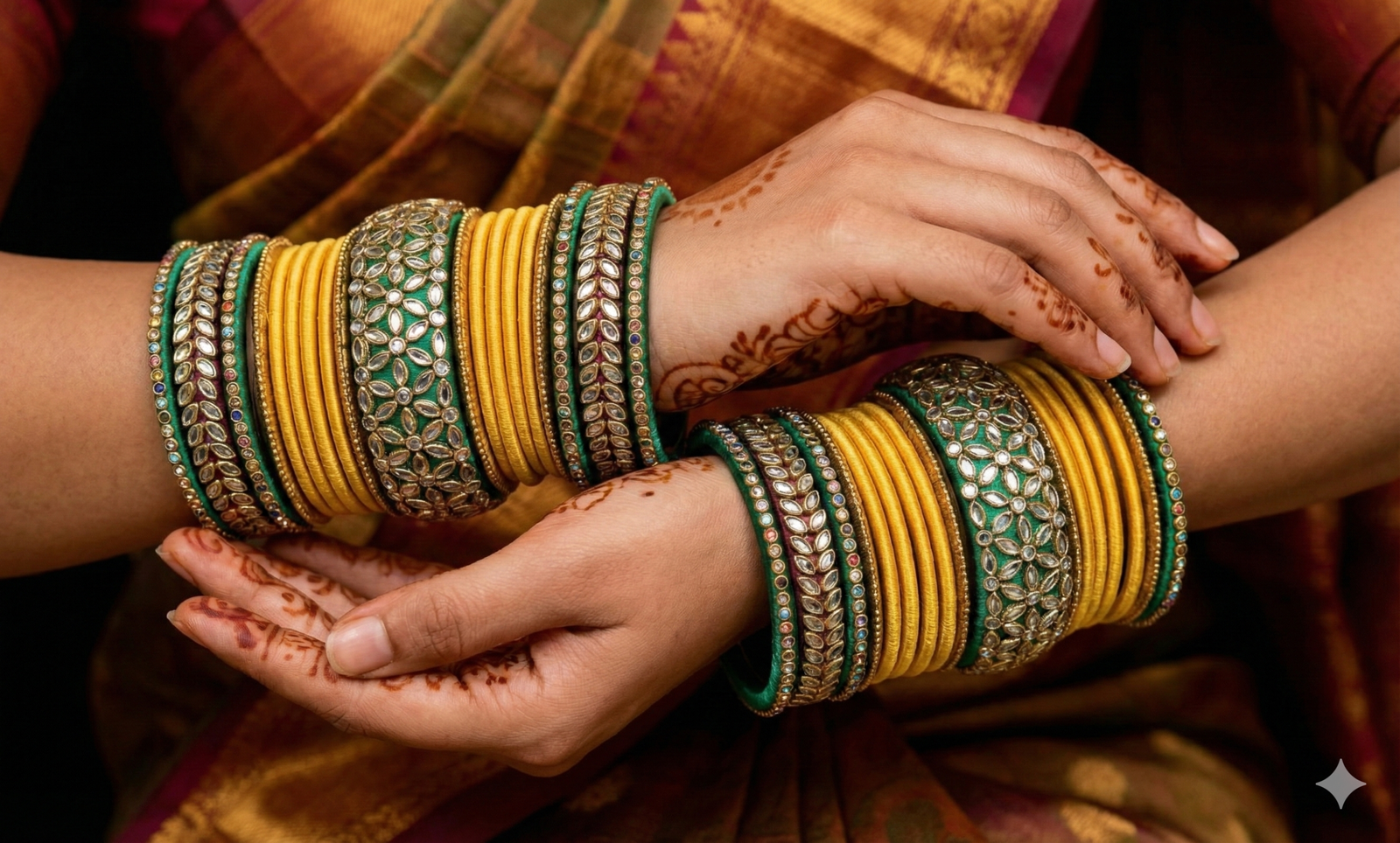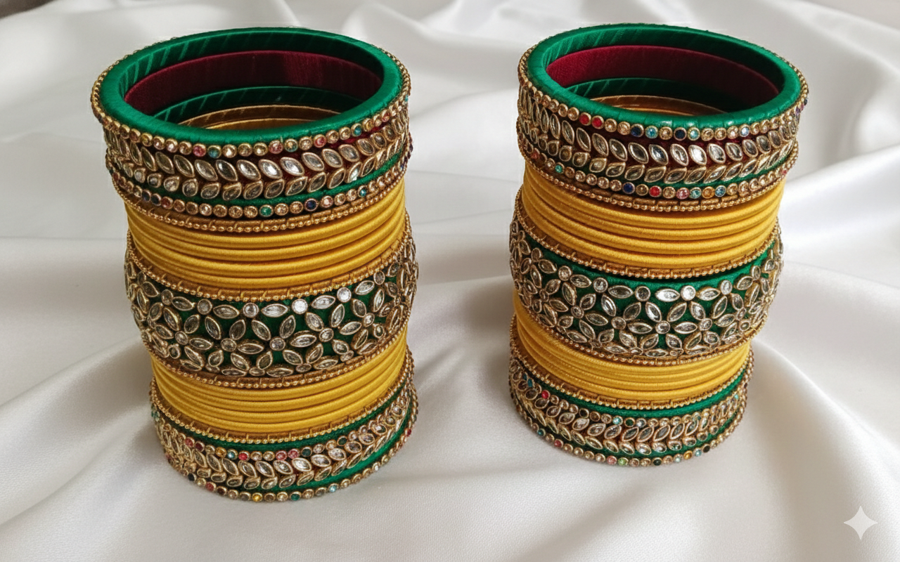 Handcrafted Silk Thread Bangle Set – Yellow & Green Kundan Chuda for Wedding & Festive Wear