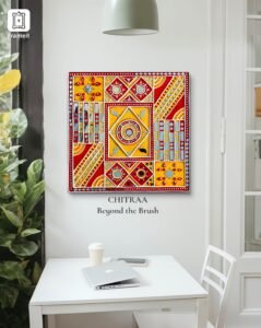 Rich reds and glowing yellows draw you into the world of Lippan art. The mirrors sparkle, adding a beautiful depth and shine, transforming the artwork into something truly mesmerizing. Pause for a moment and let these vibrant colors and intricate designs captivate your senses.