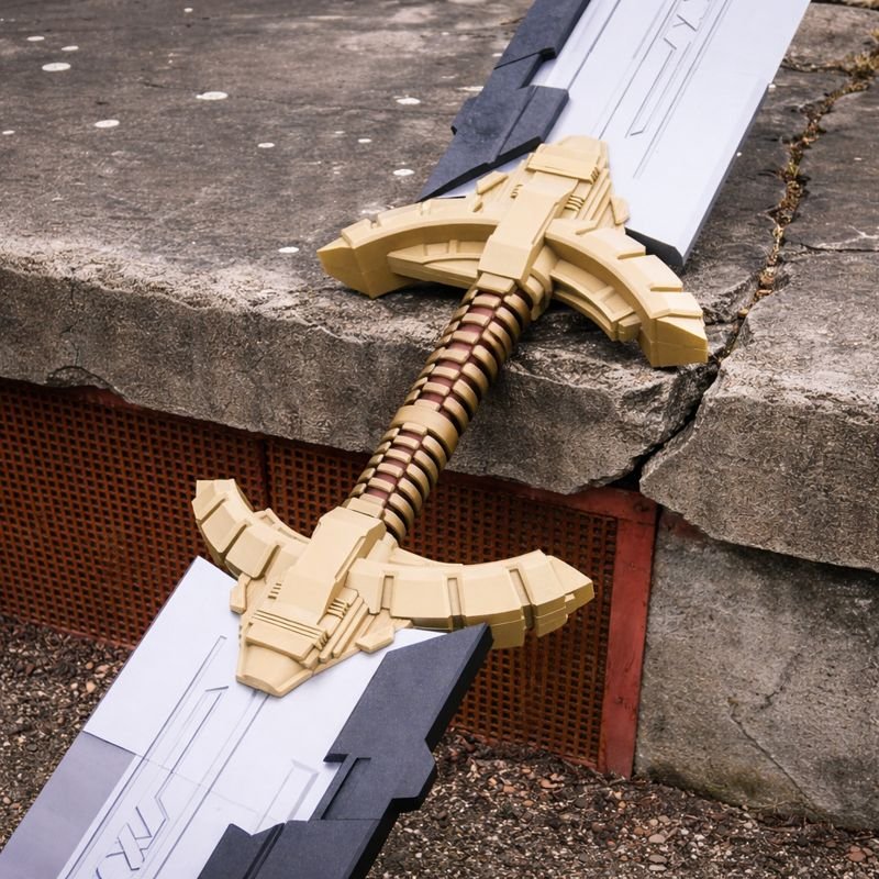 Designed with cosplay and costuming in mind, Double-Edged Sword is realistic and sturdy. Each one is carefully constructed from ABS using 3d printing and PVC pipes. Each Sword is hand-painted to give the weapon a metallic appearance.