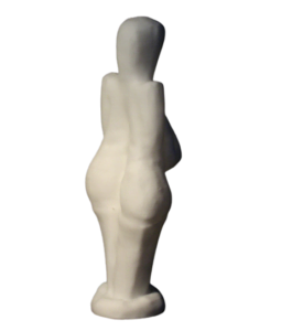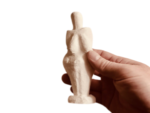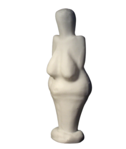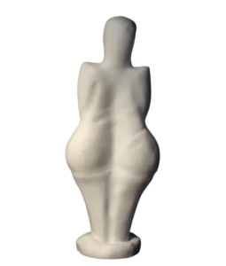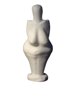Measuring 4.4 inches in height and 1.7 inches in width, (111 mm x 43 mm) the Venus of Dolni Vestonice is made from local clay mixed with powdered bone and fired in an earthen oven at a relatively low temperature of about 1300 F, or 700 C. Her characteristics are consistent with those found in most other ivory or stone Venus figurines from the same period. For instance, she has a featureless face, devoid of any detail, enormous pendulous breasts, and wide hips and buttocks. An uneven crack runs along her right hip, while there are four holes in the top of her head, possibly fixture points for herbs or flowers. In 2004, a scan of the figurine’s surface revealed the fingerprint of a child aged 7-15 years, although he/she is not thought to have been the ceramicist involved.